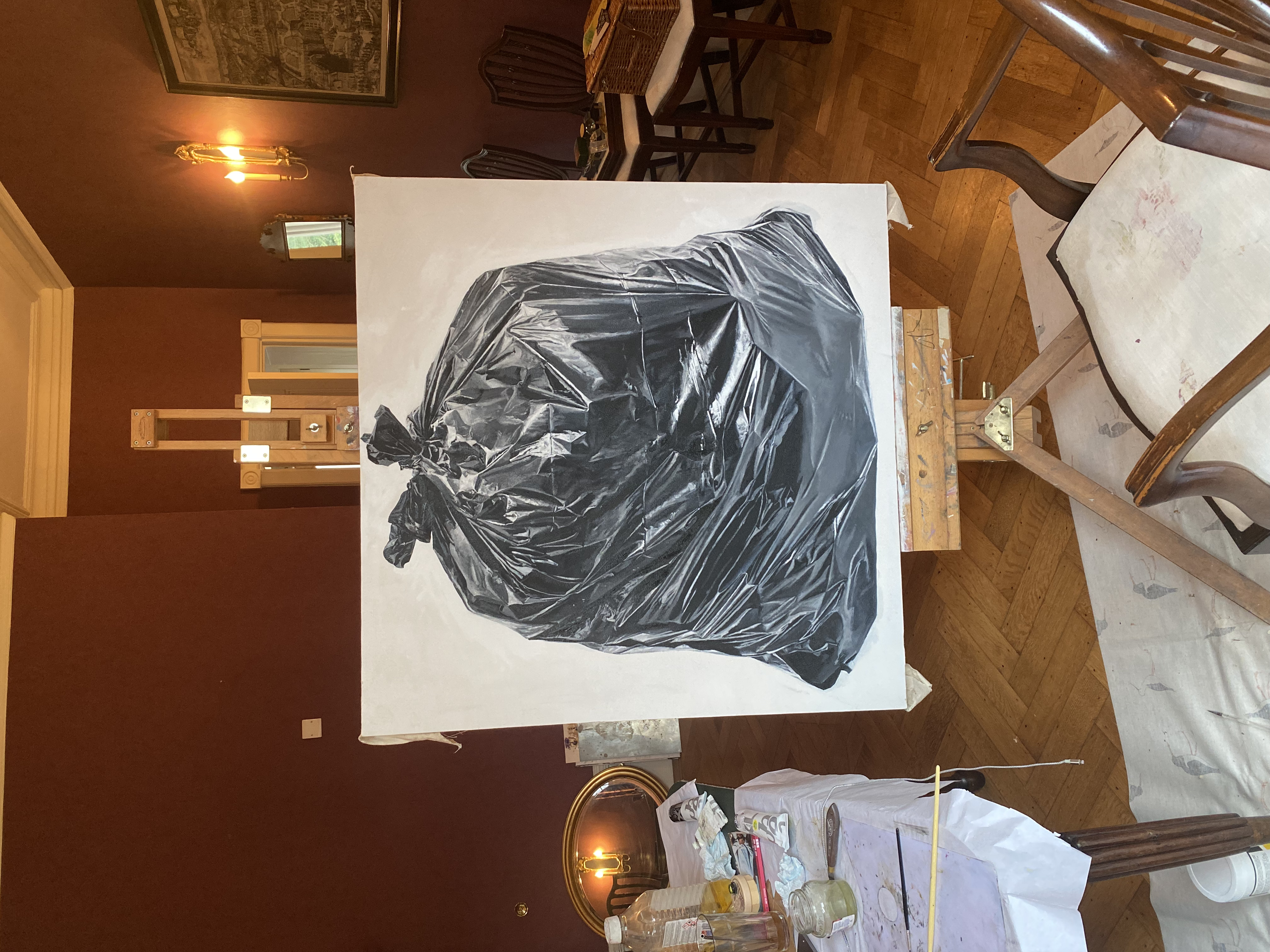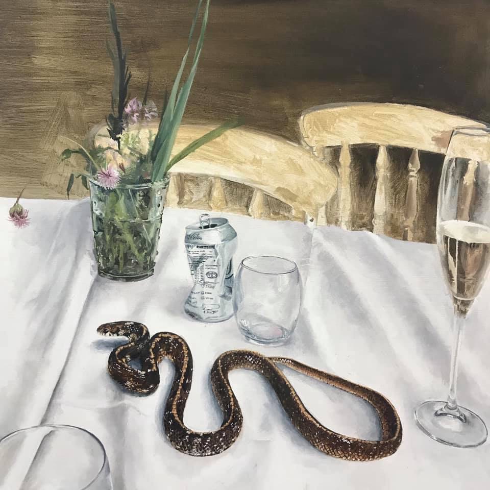 'No, not in there Sharon. The champagne is in the cellar.' Oil on canvas, 2020, (120x100cm)