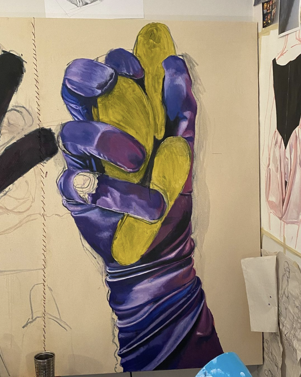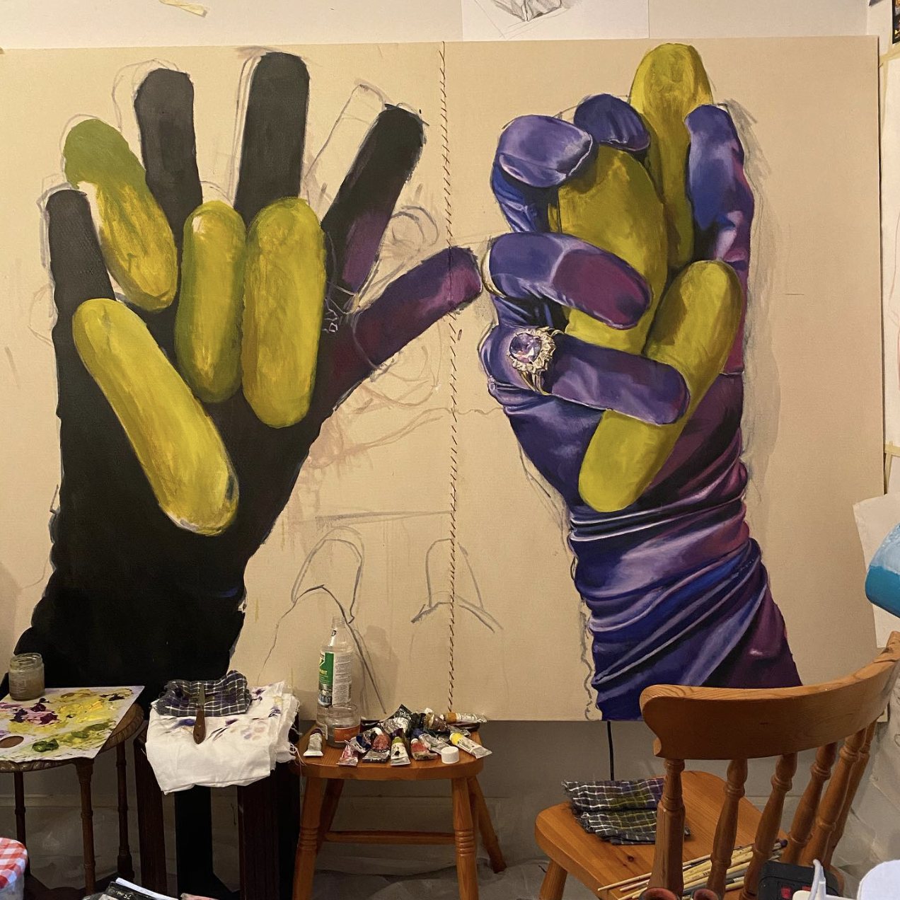'Gloved' Oil on stitched cotton, 2020 (240x120cm)