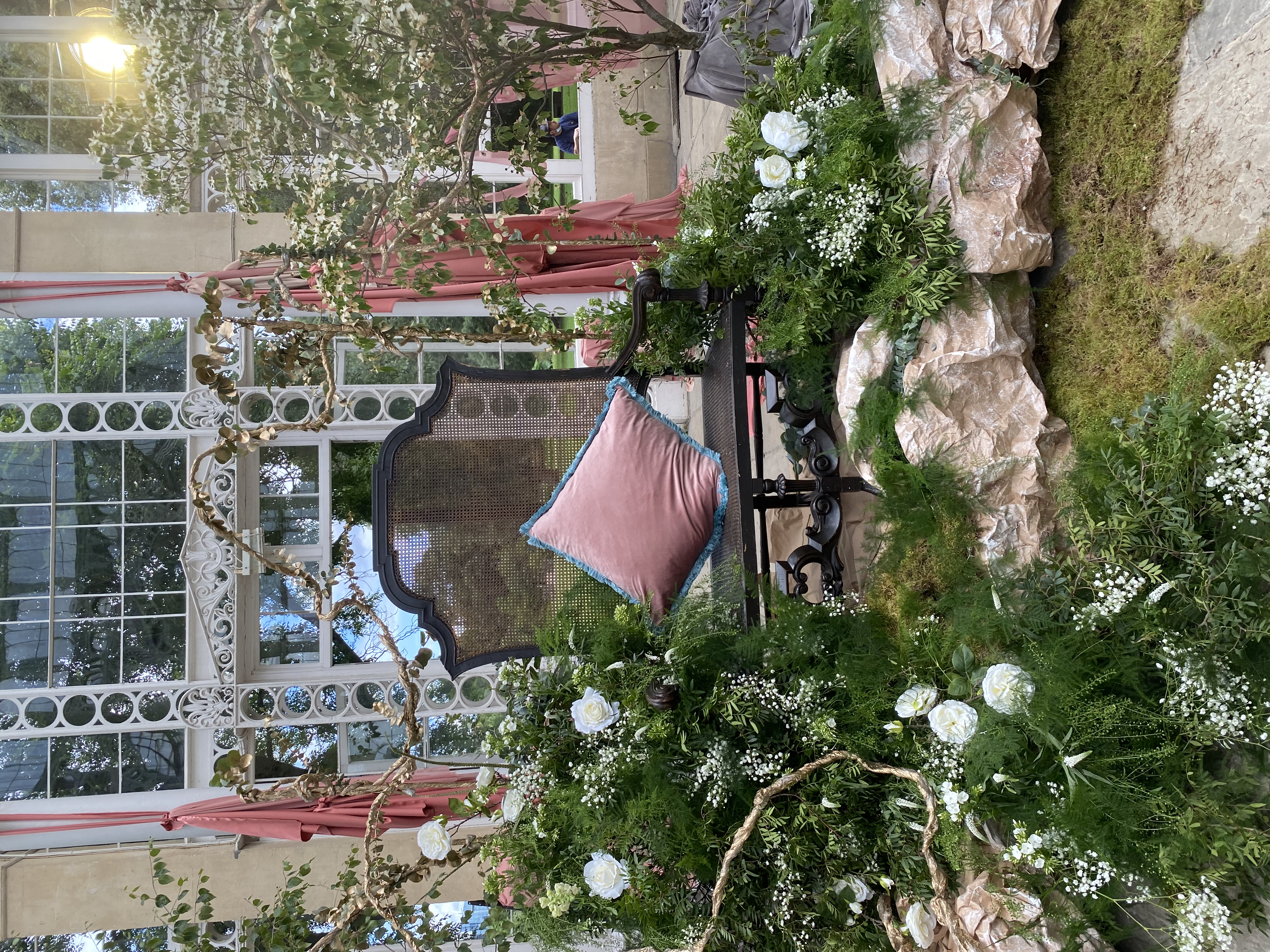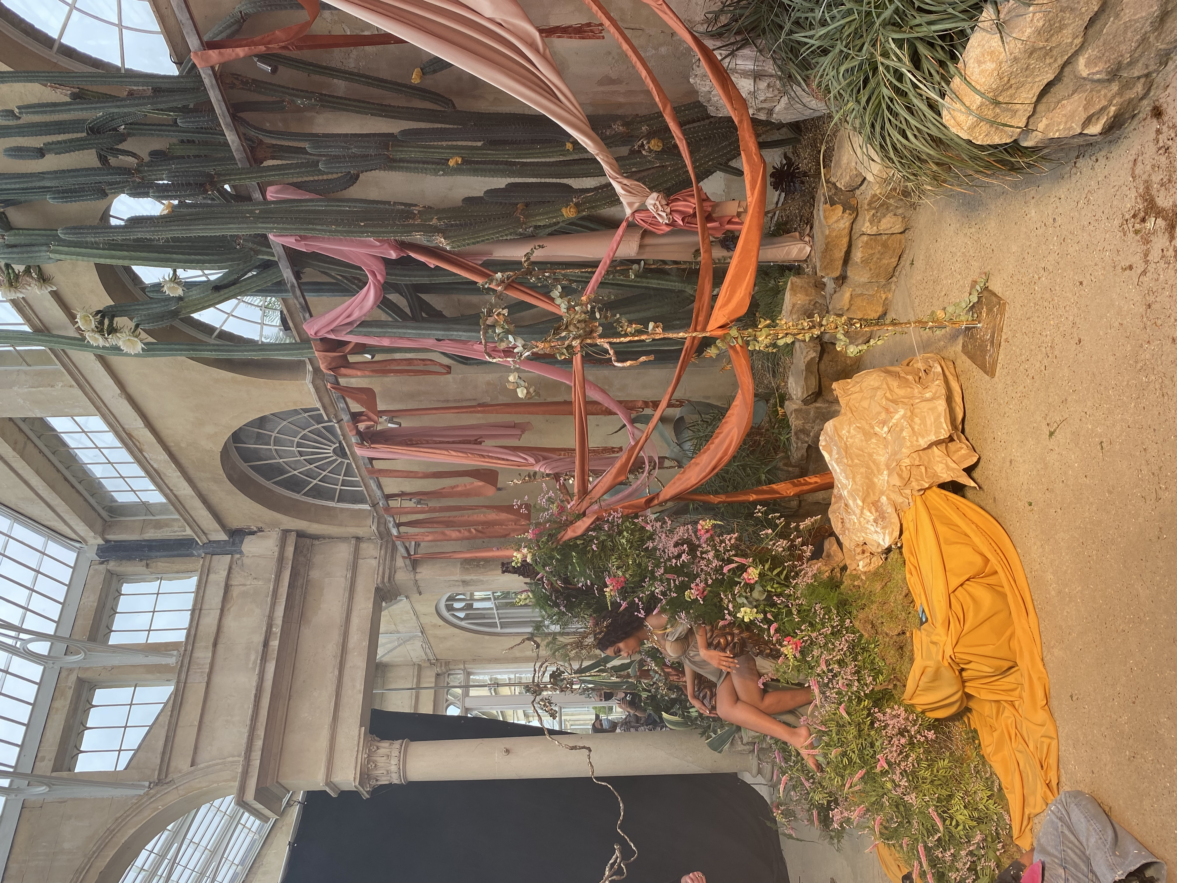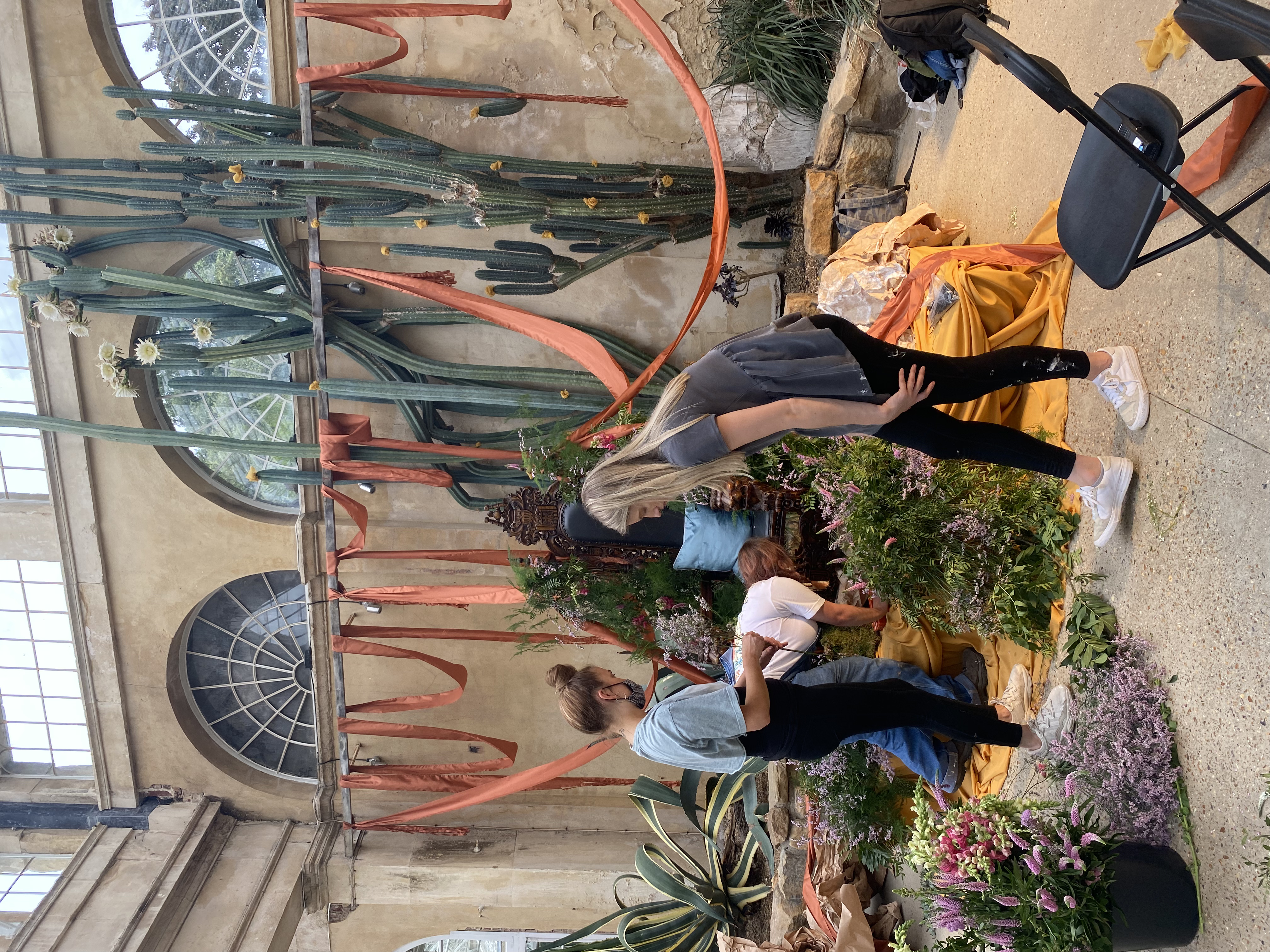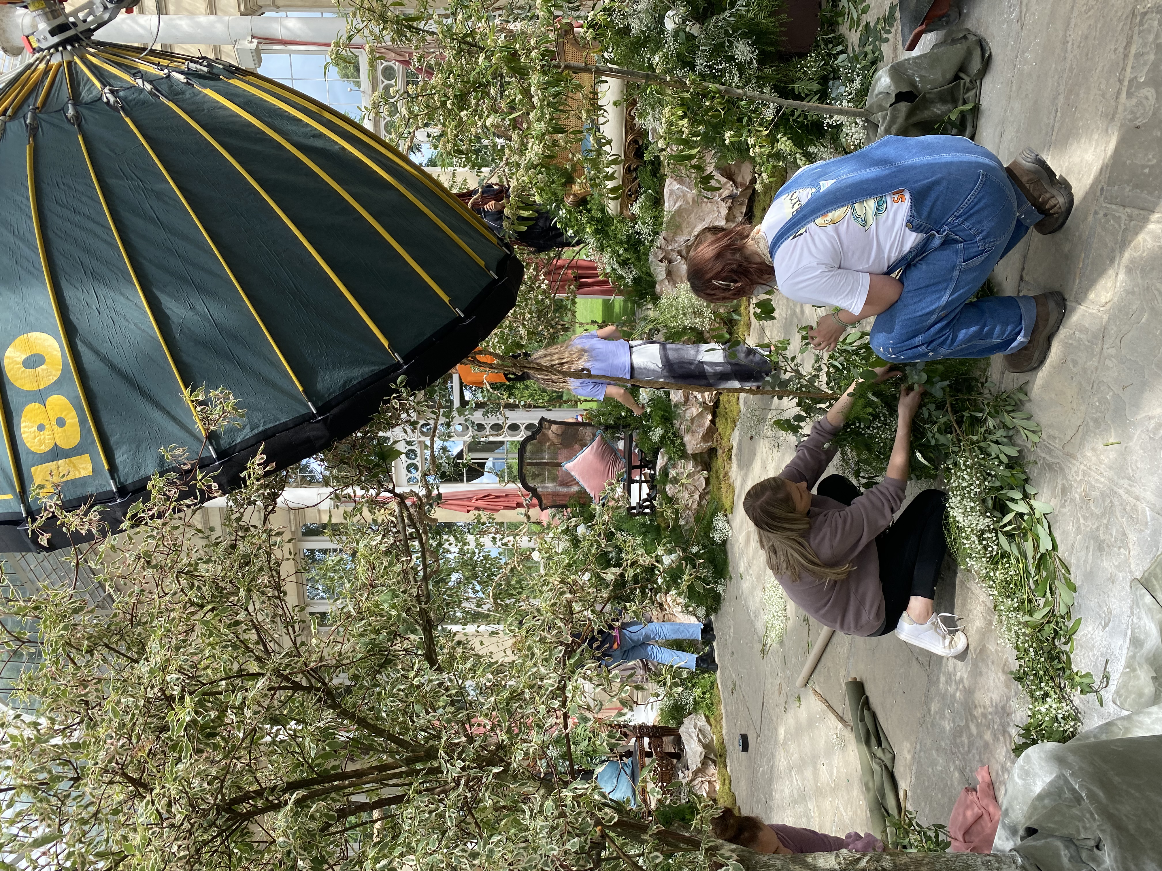 Rocks painted in acrylic, and pastel. We were also responsible for the falling fabric, plants and flowers.
