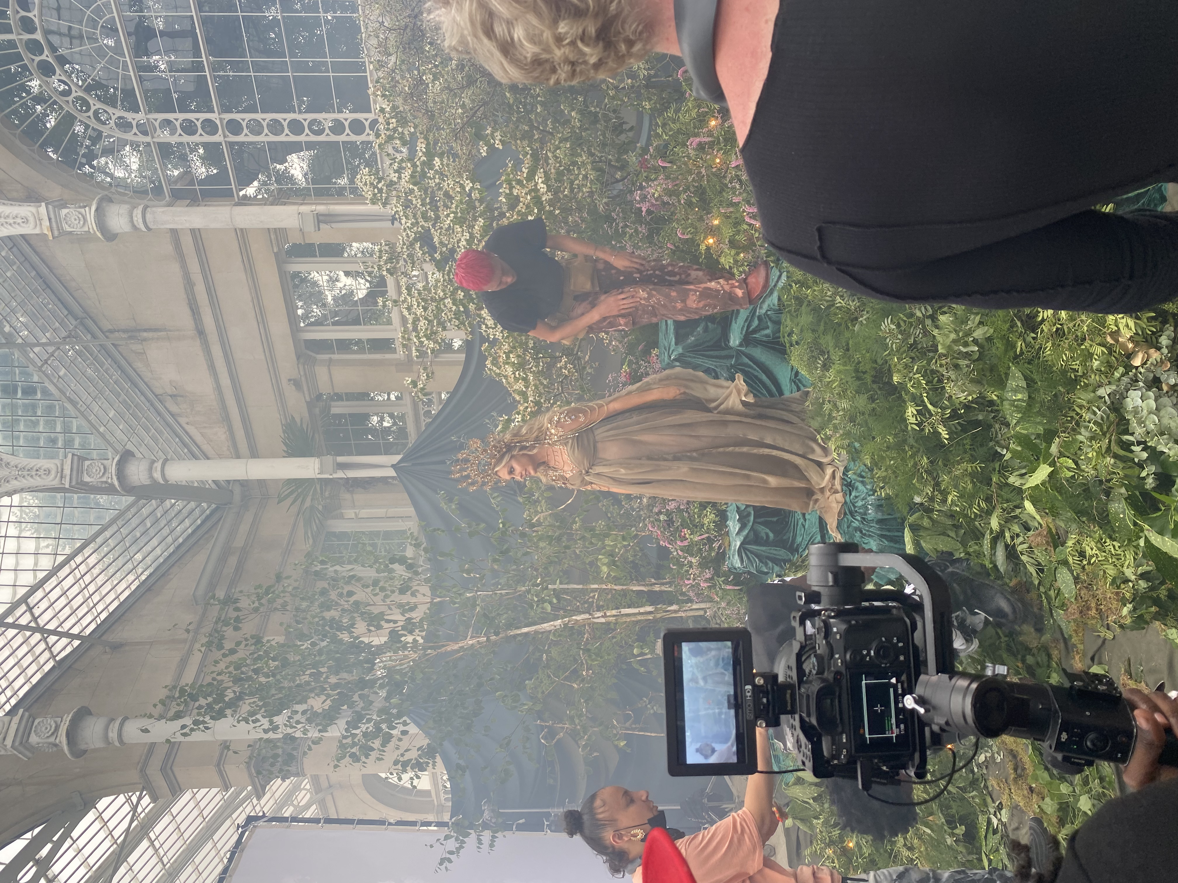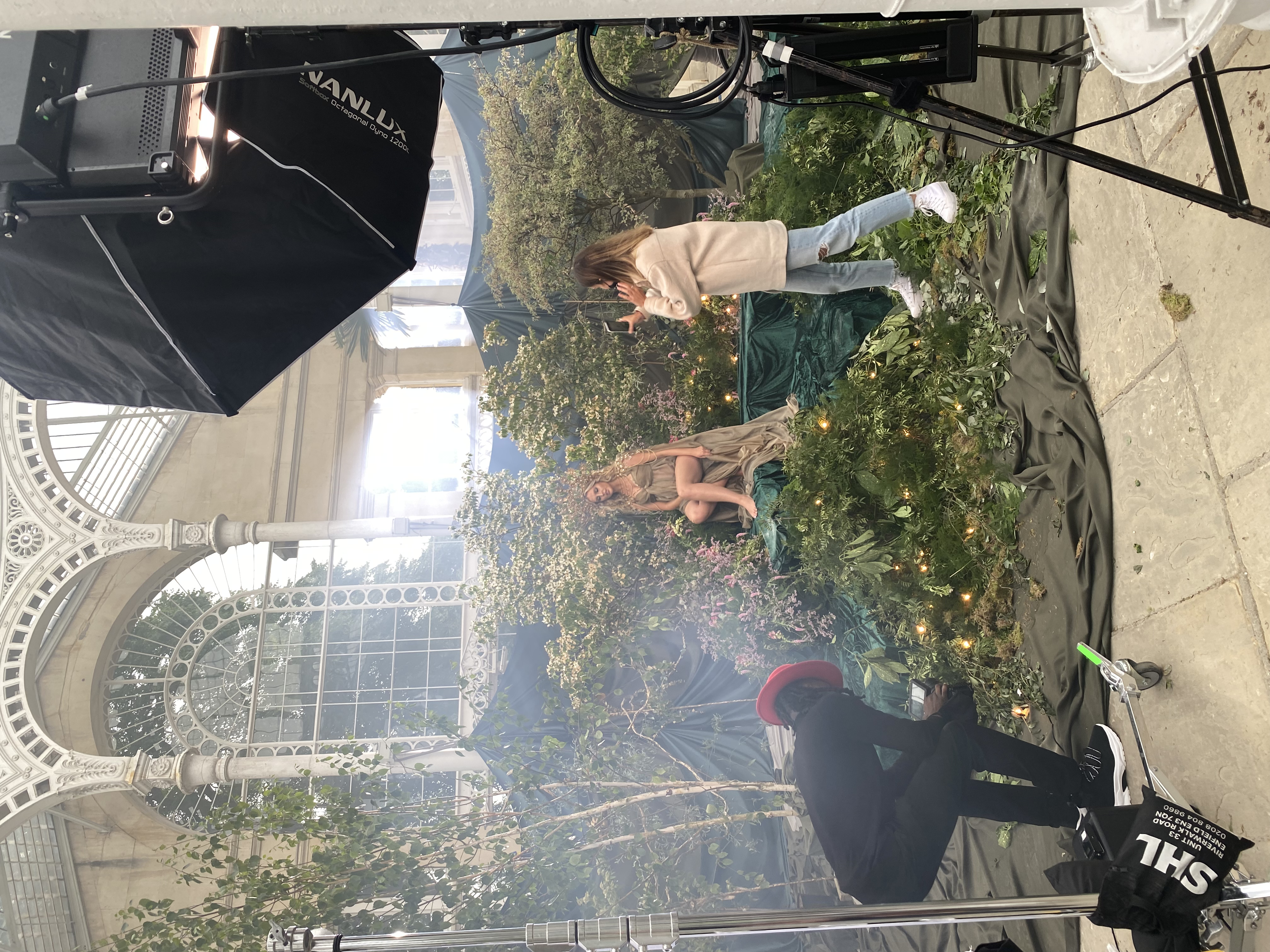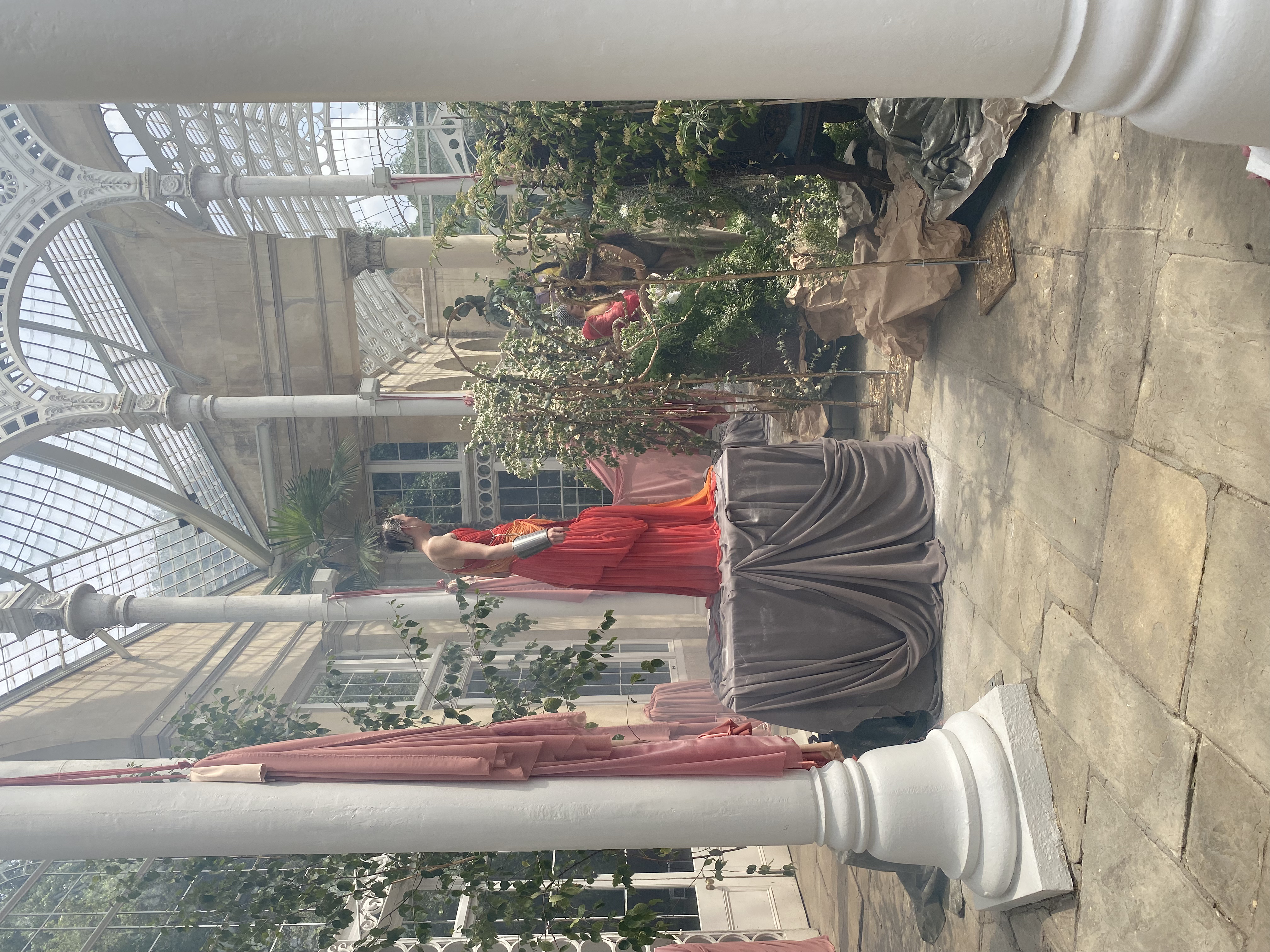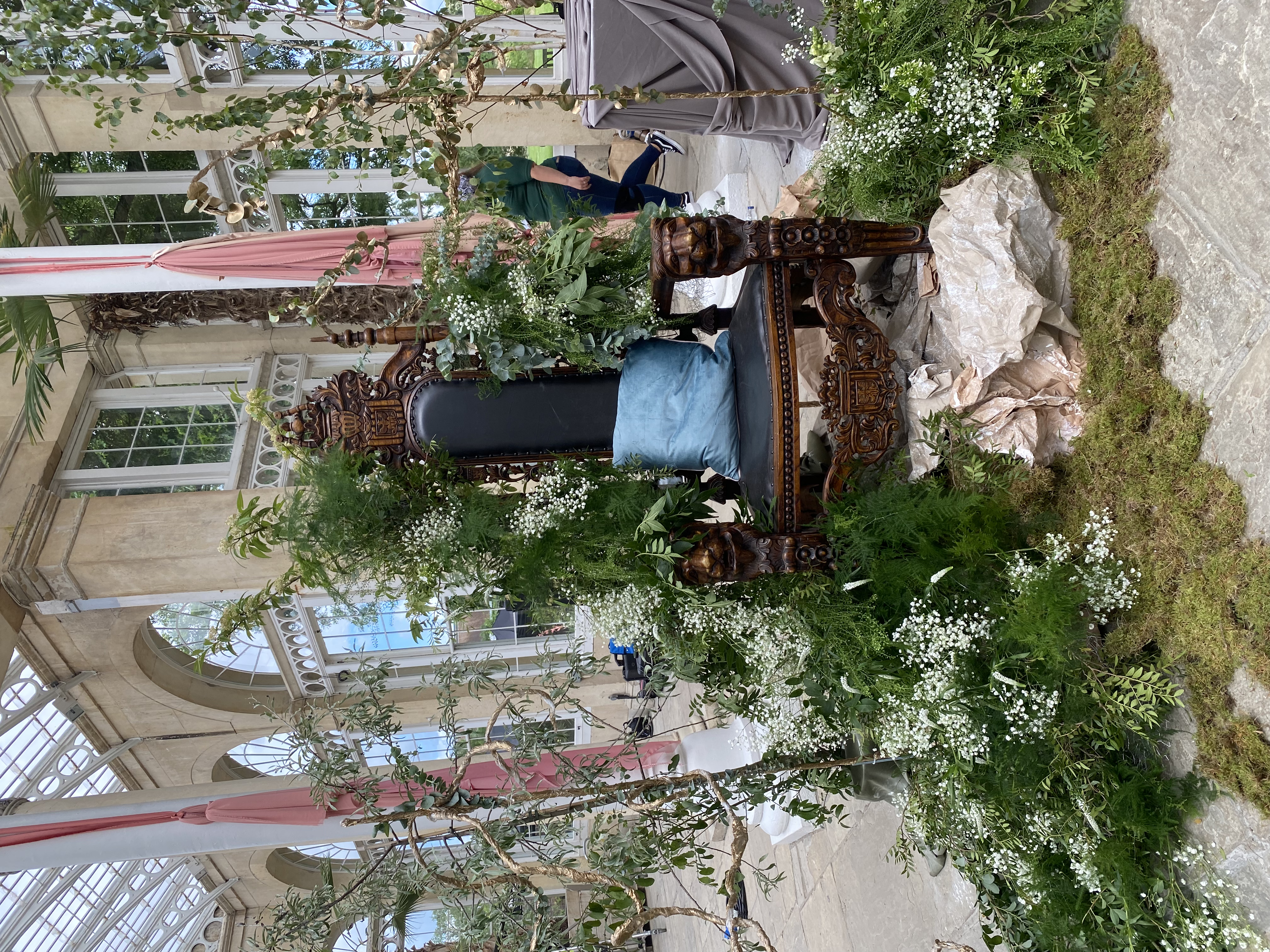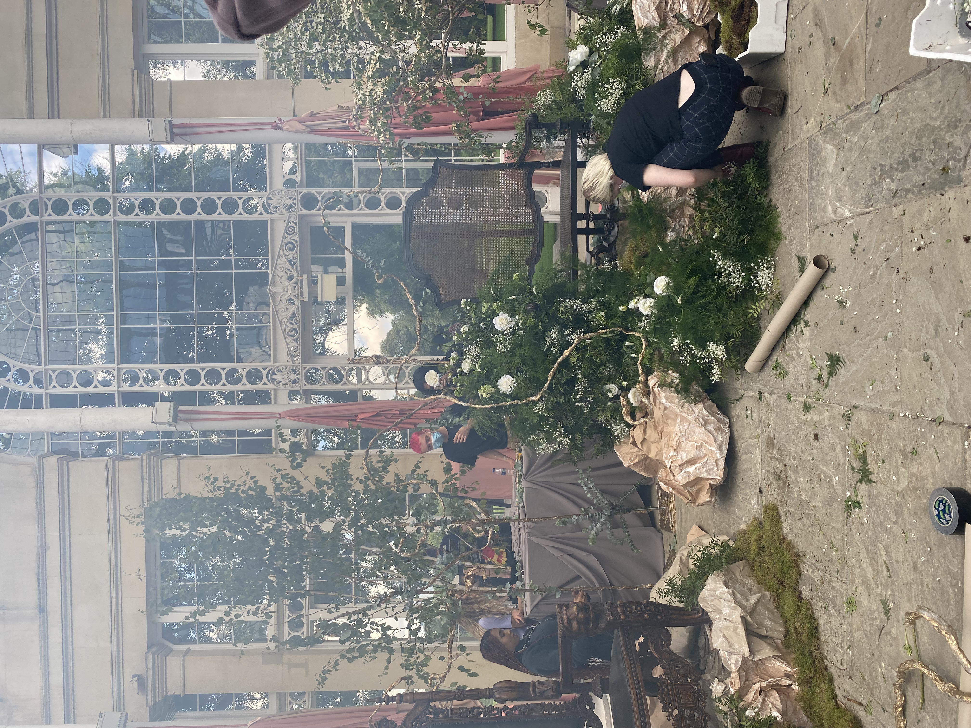 Rocks painted in acrylic, and pastel. We were also responsible for the falling fabric, plants and flowers.